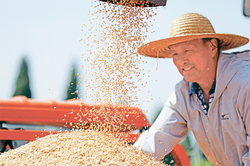 2024年,全国粮食总产量14130亿斤,在连续9年稳定在1.3万亿斤以上的基础上,首次迈上1.4万亿斤新台阶。图为2024年5月25日山东省郯城县山南头村村民将收获的小麦装车。 新华社发 张春雷/摄
