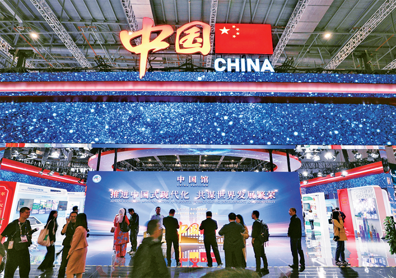 2024年11月5日至10日,第七届中国国际进口博览会在上海举办。中国馆以“推进中国式现代化,共谋世界发展繁荣”为主题,重点展示推进中国式现代化建设和推动高水平对外开放的最新成果,展现中国加快培育和发展新质生产力的崭新气象。图为11月5日拍摄的第七届进博会中国馆。 新华社记者 杜潇逸/摄